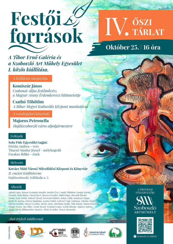 Szeretettel várunk mindenkit a nagyváradi Tibor Ernő Galéria és a Szoboszló Art Műhely Egyesület első közös kiállításának megnyitójára 2025. október 25-én 16.00 órától Hajdúszoboszlón a Kovács Máté Városi Művelődési Központ és Könyvtár II. emeleti galériájában!