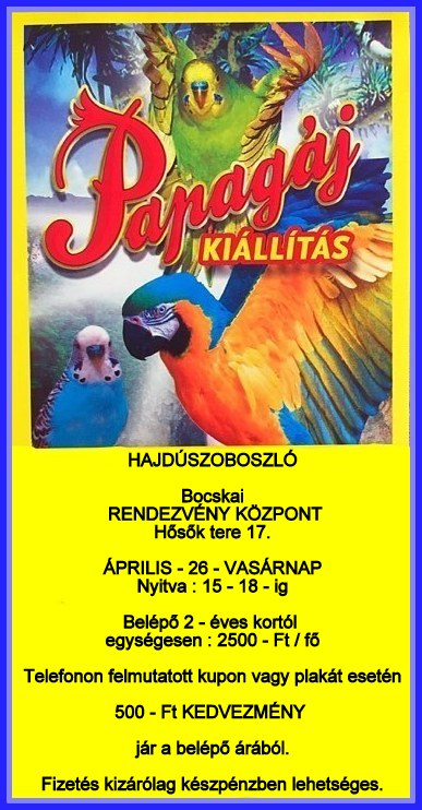 Különleges élményben lehet része mindazoknak, akik ellátogatnak a Papagáj Kiállításra Hajdúszoboszlón. A színes, egzotikus madarak testközelből csodálhatók meg, miközben a látogatók betekintést nyerhetnek a papagájok világába, életmódjába és érdekességeibe.