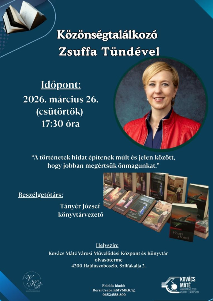 A Tavaszi Művészeti Napok programsorozat részeként különleges irodalmi estére várják az érdeklődőket Hajdúszoboszlón: 2026. március 26-án, csütörtökön 17.30 órától közönségtalálkozóra érkezik Zsuffa Tünde a Kovács Máté Városi Művelődési Központ és Könyvtár olvasótermébe.