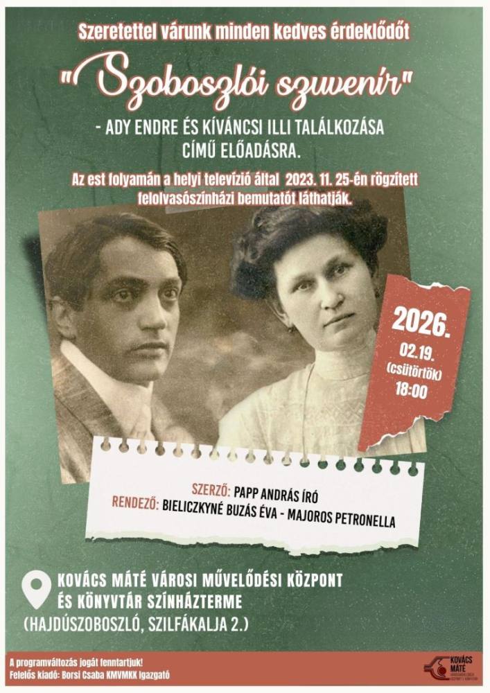 Szeretettel várunk minden kedves érdeklődőt 2026. február 19-én (csütörtökön) 18 órától a "Szoboszlói Szuvenír" Ady Endre és Kíváncsi Illi találkozása című előadásnak, a helyi televízió által 2023. november 25-én rögzített bemutatójára.